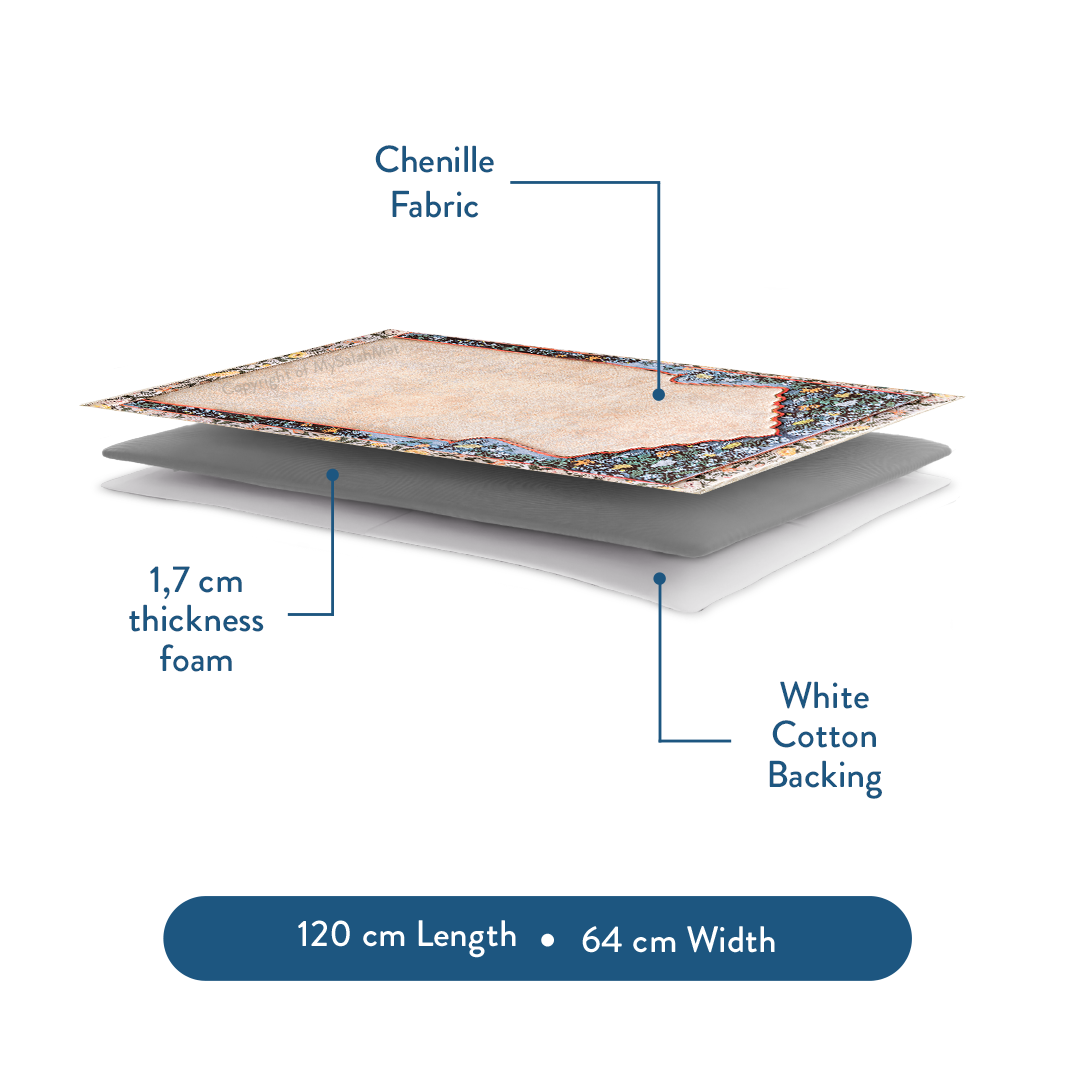 Crafted with velvety-soft fabric and cushioned with 1.7 cm of thick foam padding, it provides superior comfort for your knees and feet. The engraved floral detailing adds refinement and texture, while the three-layer construction ensures lasting durability. Finished with a white cotton back layer, this prayer mat remains stable and secure on any surface.
