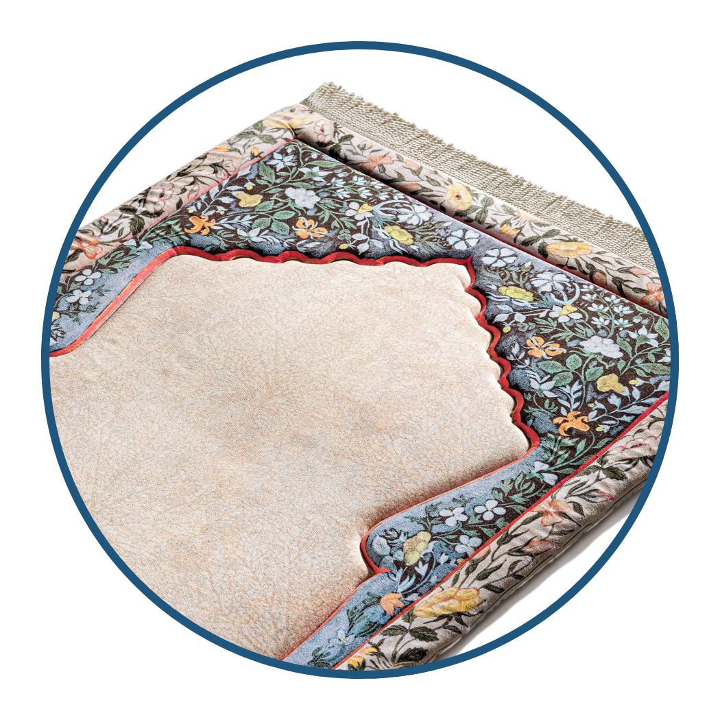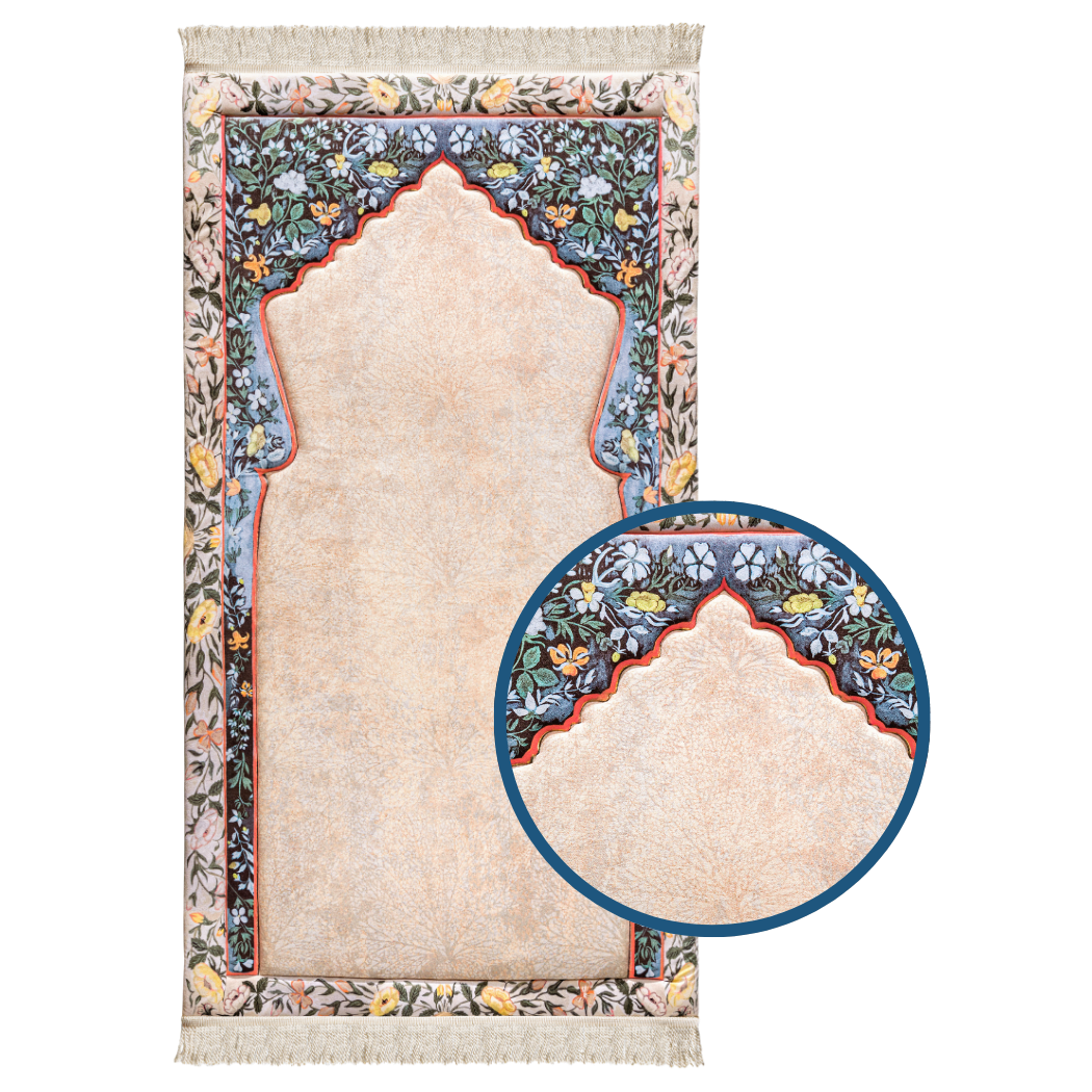 Inspired by the timeless beauty of Andalusian gardens, this design showcases intricate floral borders and calming earthy tones. Crafted with premium padding and soft, durable materials, it blends elegance and tranquillity with everyday comfort. A serene reflection of artistry and devotion, enhancing the peace of every salah.