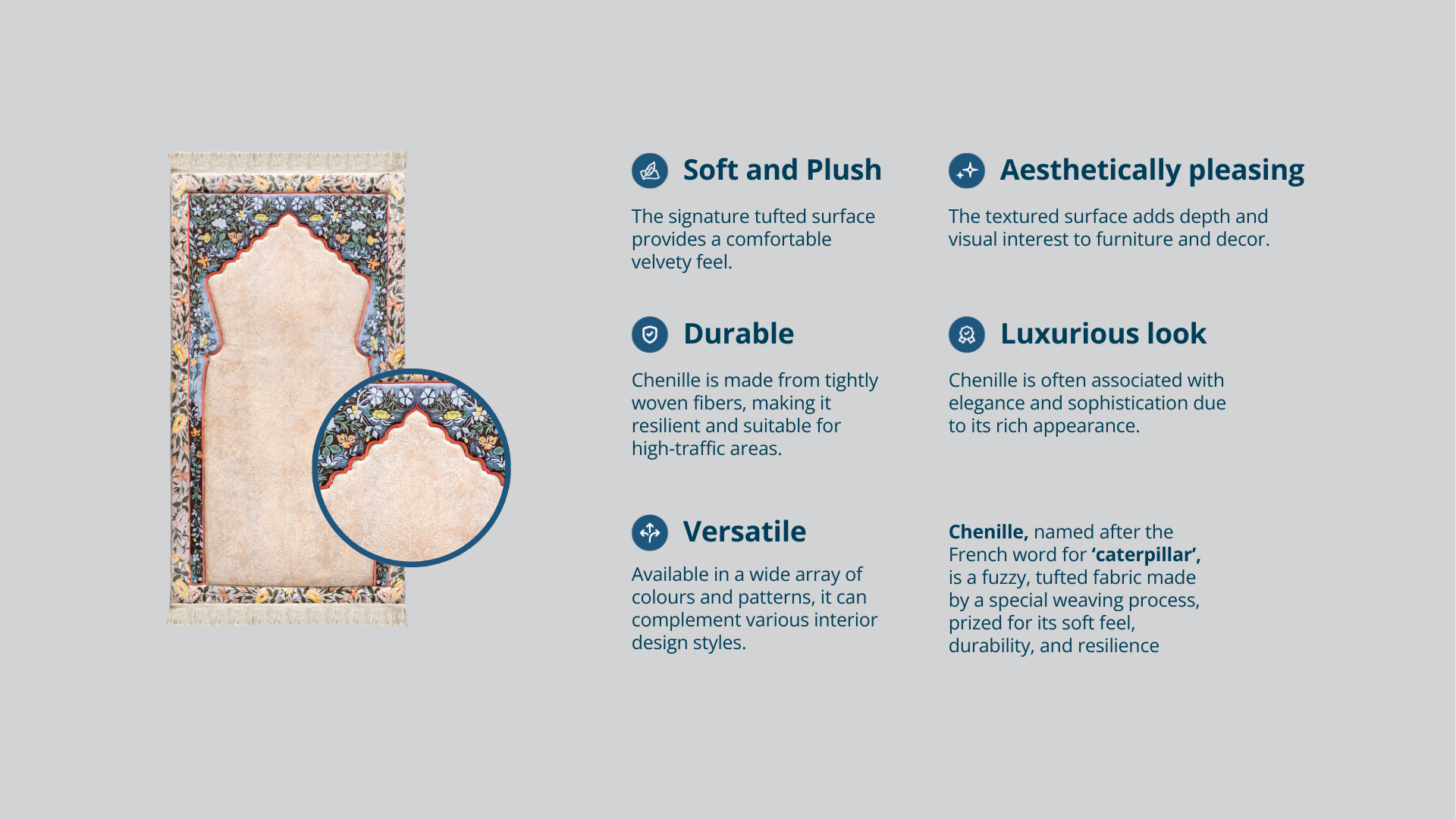 Velvety-smooth chenille adds luxury and softness, enhancing both comfort and elegance in your daily prayer.