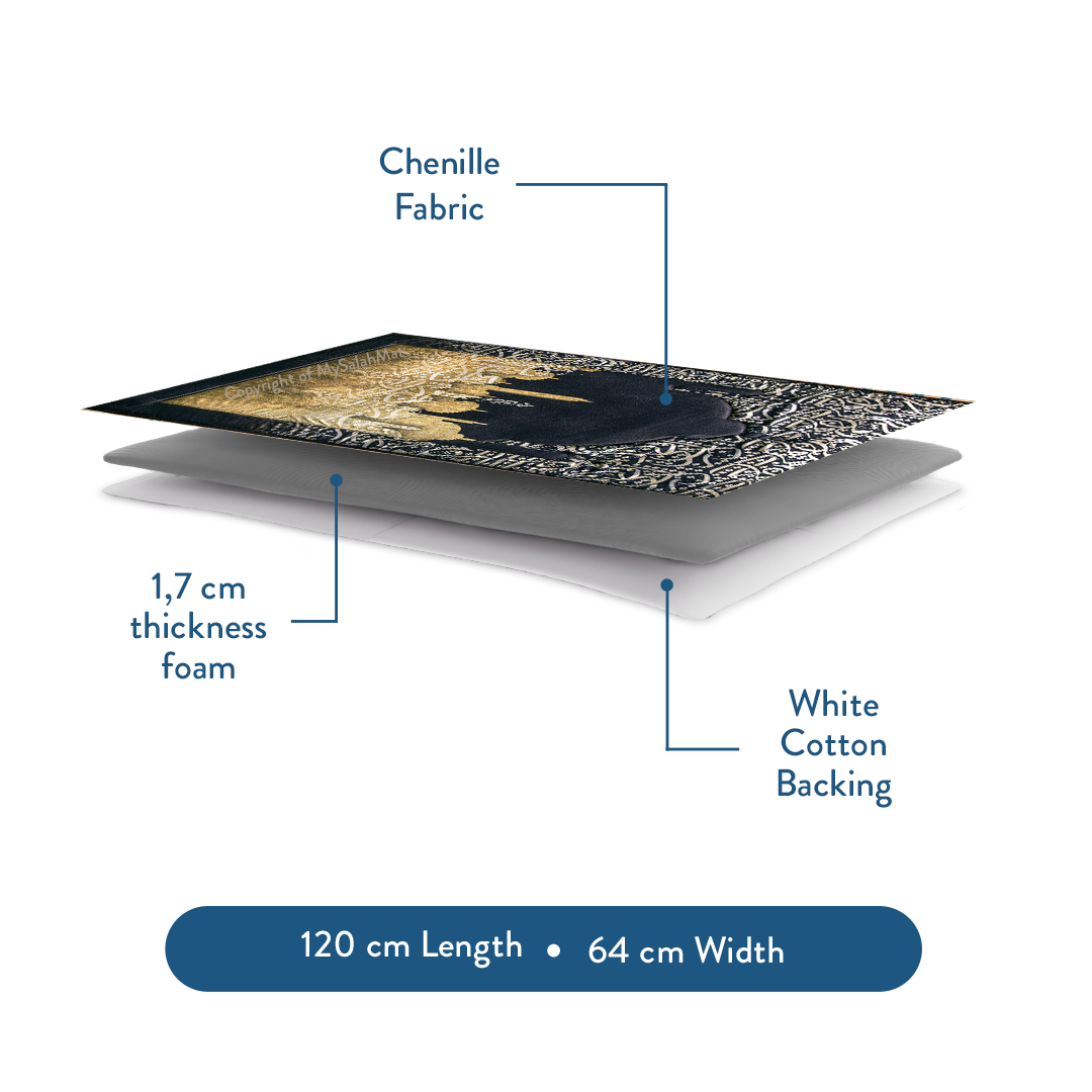Urban Rugs UK presents the Adult Padded Prayer Mat with Dark Arabic Calligraphy Design, a striking blend of tradition and elegance. Featuring intricate Arabic calligraphy in shimmering gold tones against a deep dark background, this mat creates a powerful and uplifting prayer atmosphere.