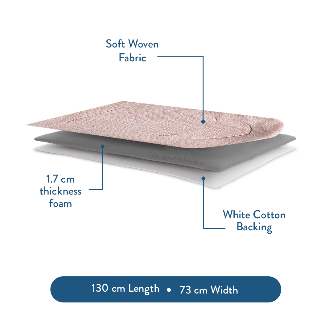 Crafted from soft woven fabric and cushioned with 1.7 cm of supportive foam, this mat provides comfort for your knees and feet during every prayer. Its three-layer construction ensures long-lasting durability, while the white cotton back layer offers a stable, non-slip foundation for peace of mind.