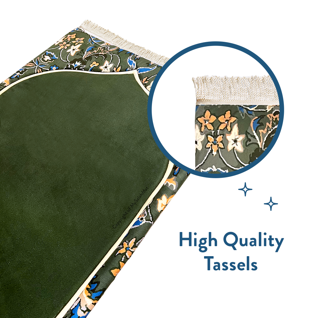 Crafted with velvety-soft fabric and cushioned with 1.7 cm of thick foam padding, it offers exceptional comfort and support for your knees and feet. The refined border detailing adds depth and character, while the three-layer construction ensures durability for long-term use. Finished with a white cotton back layer, this prayer mat stays secure and stable on any surface.