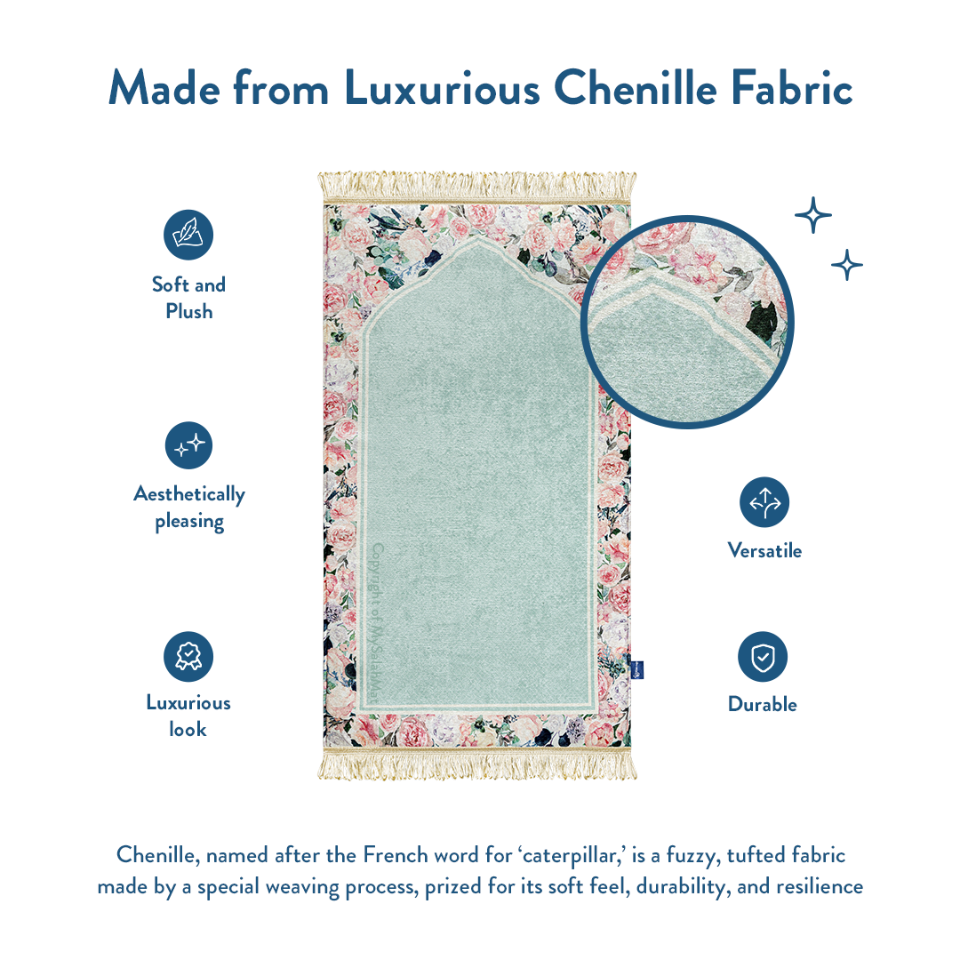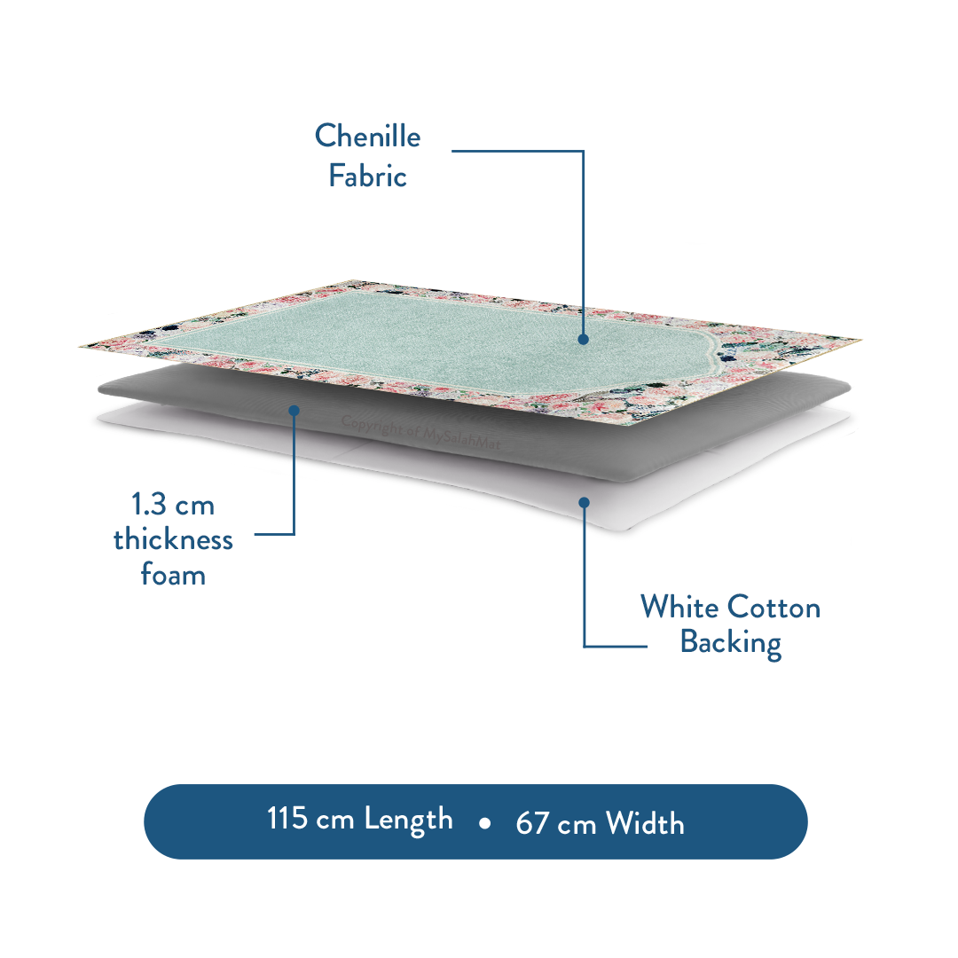 Crafted from luxurious chenille fabric, this padded prayer mat is designed for comfort, with 1.3 cm thick foam padding that provides excellent support for your knees and head during prayer. The three-layer construction ensures durability, while the white cotton back layer adds stability and prevents slipping.