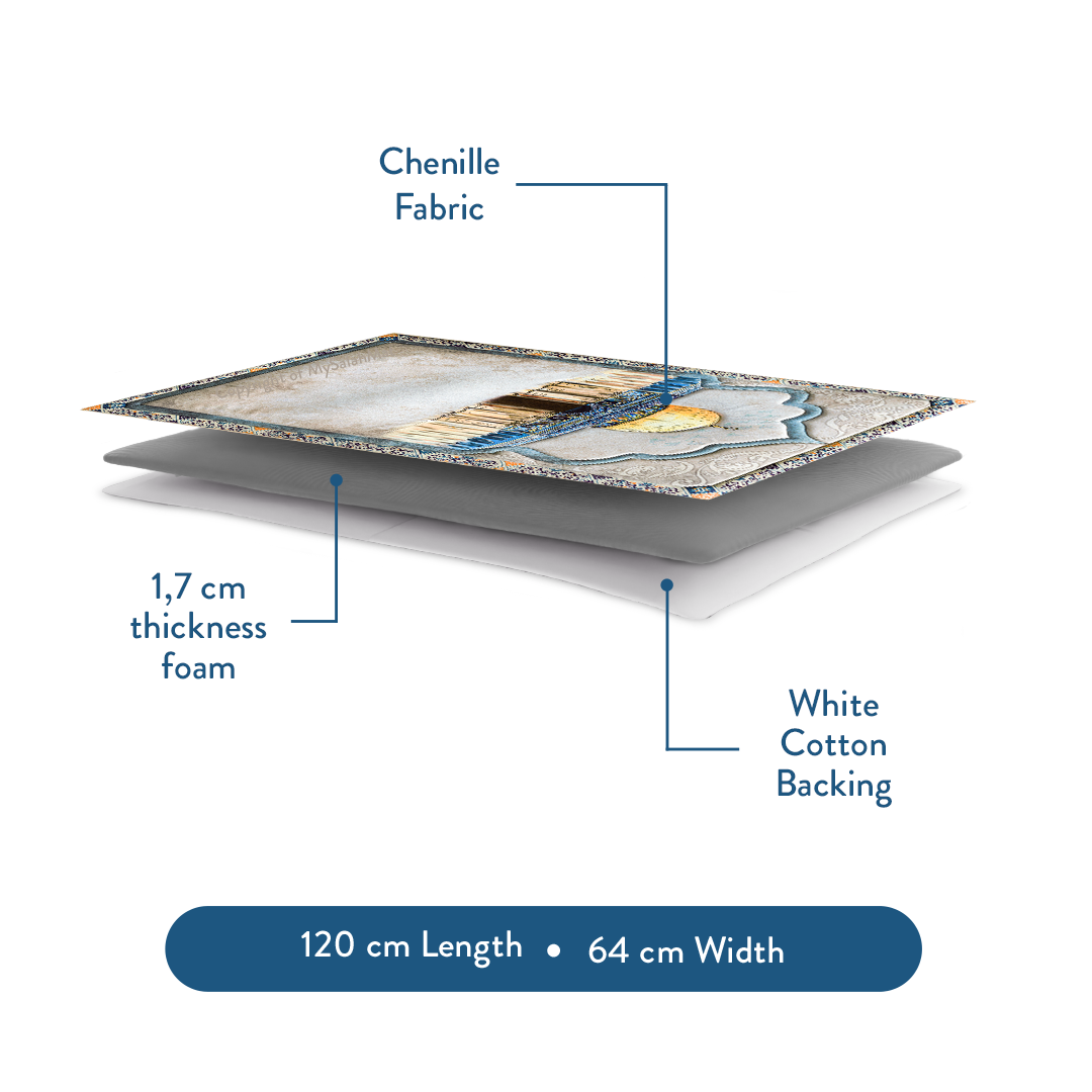 Hand-sewn with plush, velvety-soft fabric and 1.7 cm thick padding, it provides exceptional cushioning for your knees and feet, ensuring a serene and comfortable prayer experience. The three-layer construction enhances durability, while the engraved detailing and ornate border patterns add a sophisticated touch.