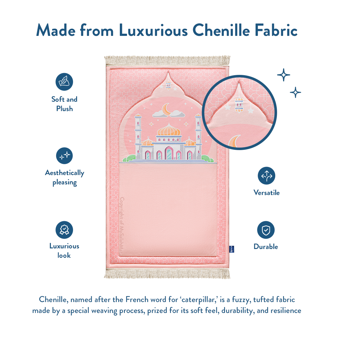 Encourage your little girl to embrace salah with the Padded Kids Prayer Mat with Blush Pink Design. Designed especially for girls, Urban Rugs UK's prayer mat features a soft blush pink colour with delicate, engraved designs, creating a serene and stylish space for prayer.