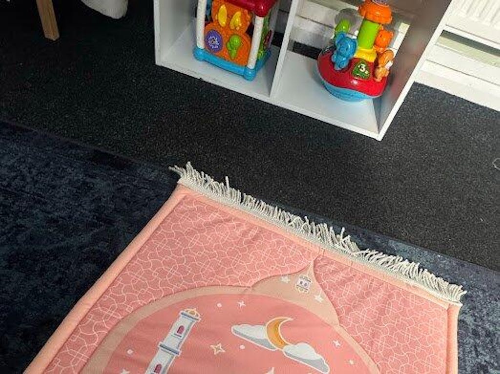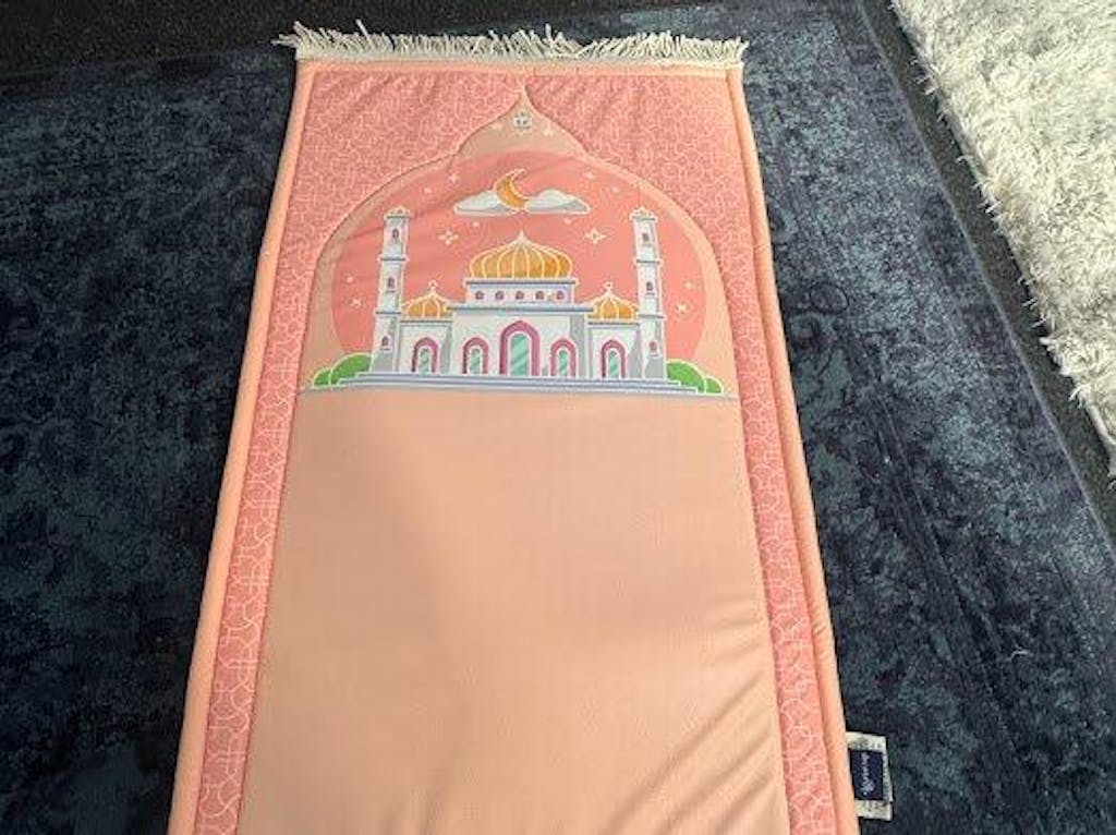 Featuring a bright pink hue and a charming mosque illustration, this mat adds a playful pop of colour to your child’s prayer space. Soft, padded, and inviting — it’s designed to make every Salah feel special and exciting.