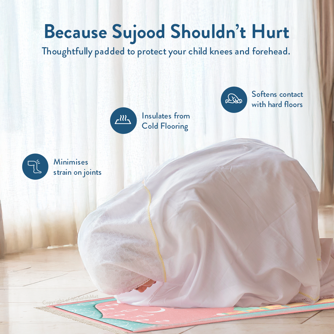 Urban Rugs UK brings beauty and comfort to children’s salah time with our Padded Kids Prayer Mat in Pink Mumbai Mosque Design. Inspired by vibrant Islamic architecture, the playful pastel colours and mosque illustration create a joyful and inviting atmosphere, encouraging little ones to love their prayer space.